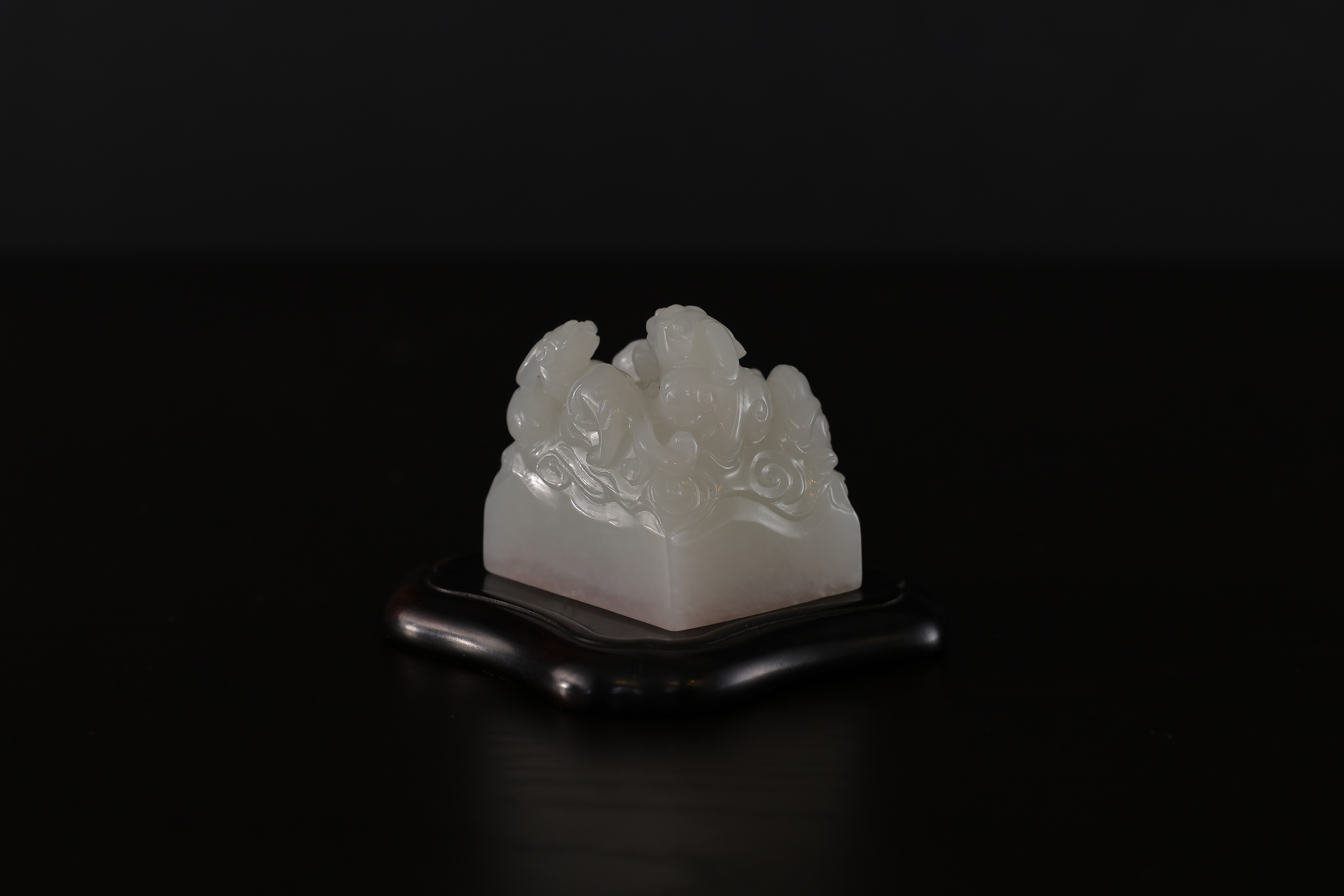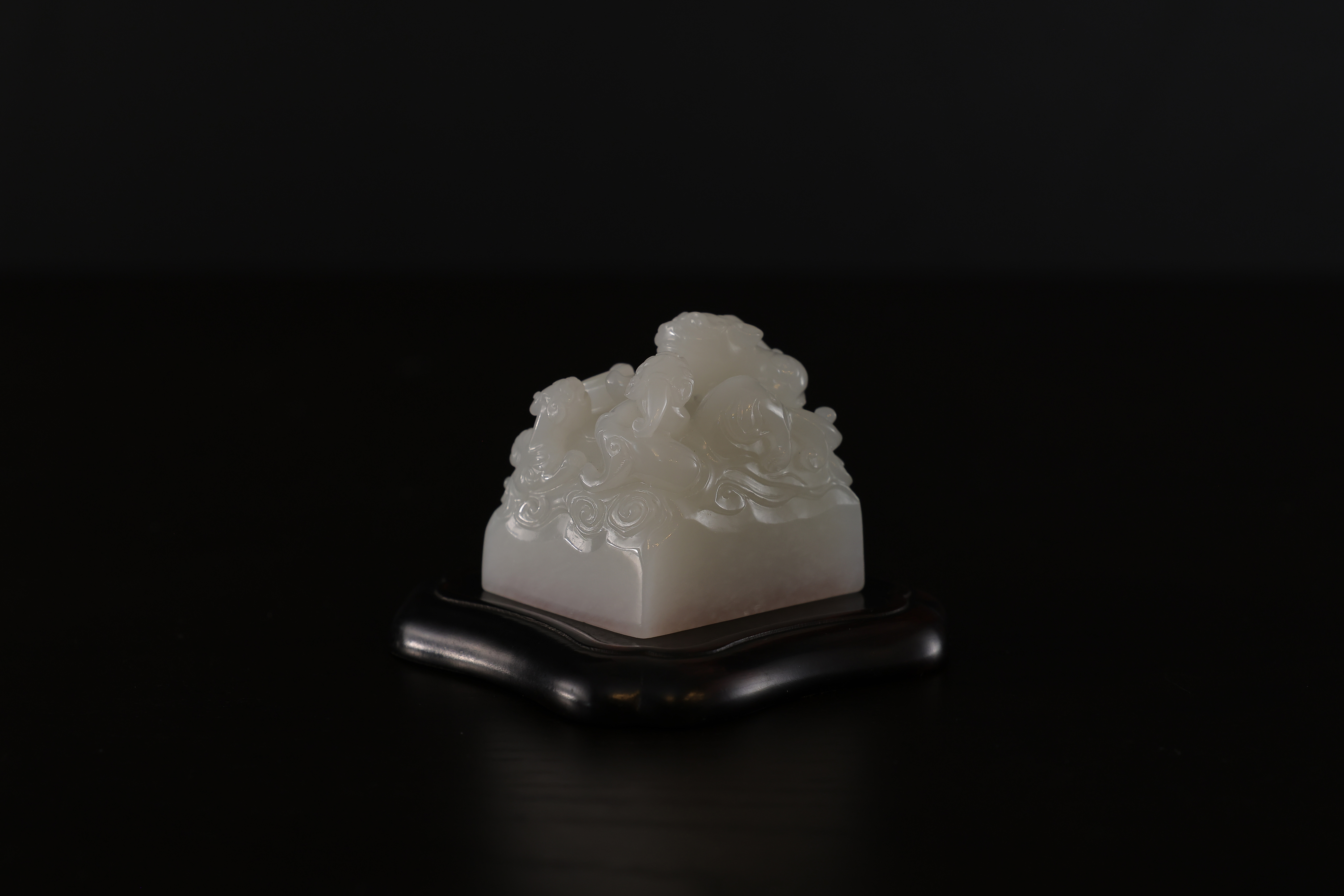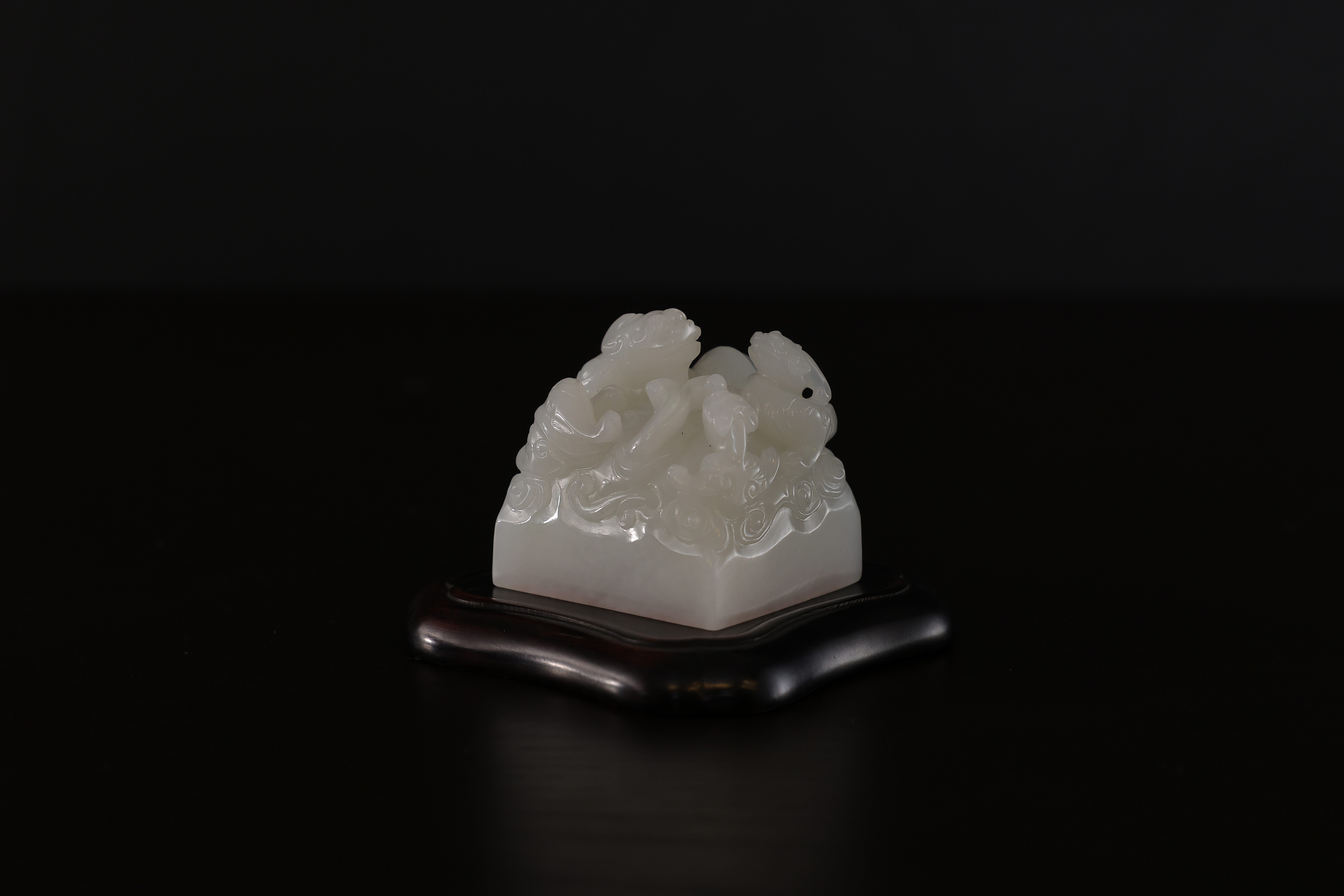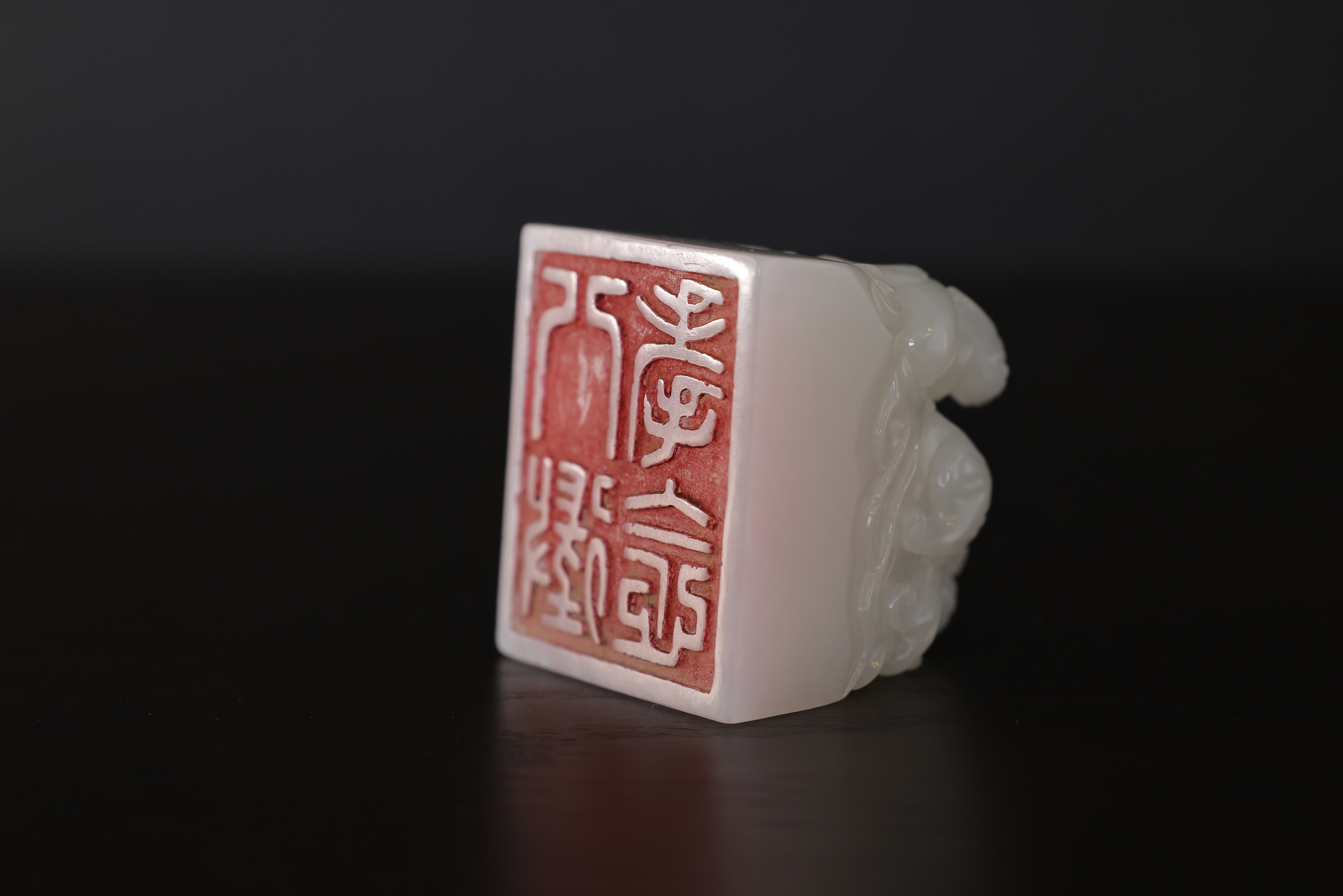 此玺爲清乾隆時期禦制“和田玉八征耄念之寶”,以上乘白玉精雕而成,玉質溫潤細膩,色澤瑩潔如脂,呈凝練的羊脂白。印體方正厚重,棱角分明,規整端莊,顯帝玺威儀。紐作雙螭龍盤踞祥雲之上,龍身蜿蜒起伏,鱗鬣精致,氣勢遒勁,雕工圓熟生動,寓意祥瑞護佑、乾坤永固。印面朱文篆刻,筆畫古樸遒勁,刀法穩健厚重,氣勢恢宏。此印爲乾隆帝八旬壽慶所制,以紀其“八征功成、福壽並臻”之盛世自況,兼寓“天命綿長、國祚恒昌”之意。整體造型雄健典雅,玉質與工藝相得益彰,展現出乾隆禦制玉玺莊重雍容、精工入微的皇家氣象,堪稱清代宮廷玉雕藝術的巅峰之作。