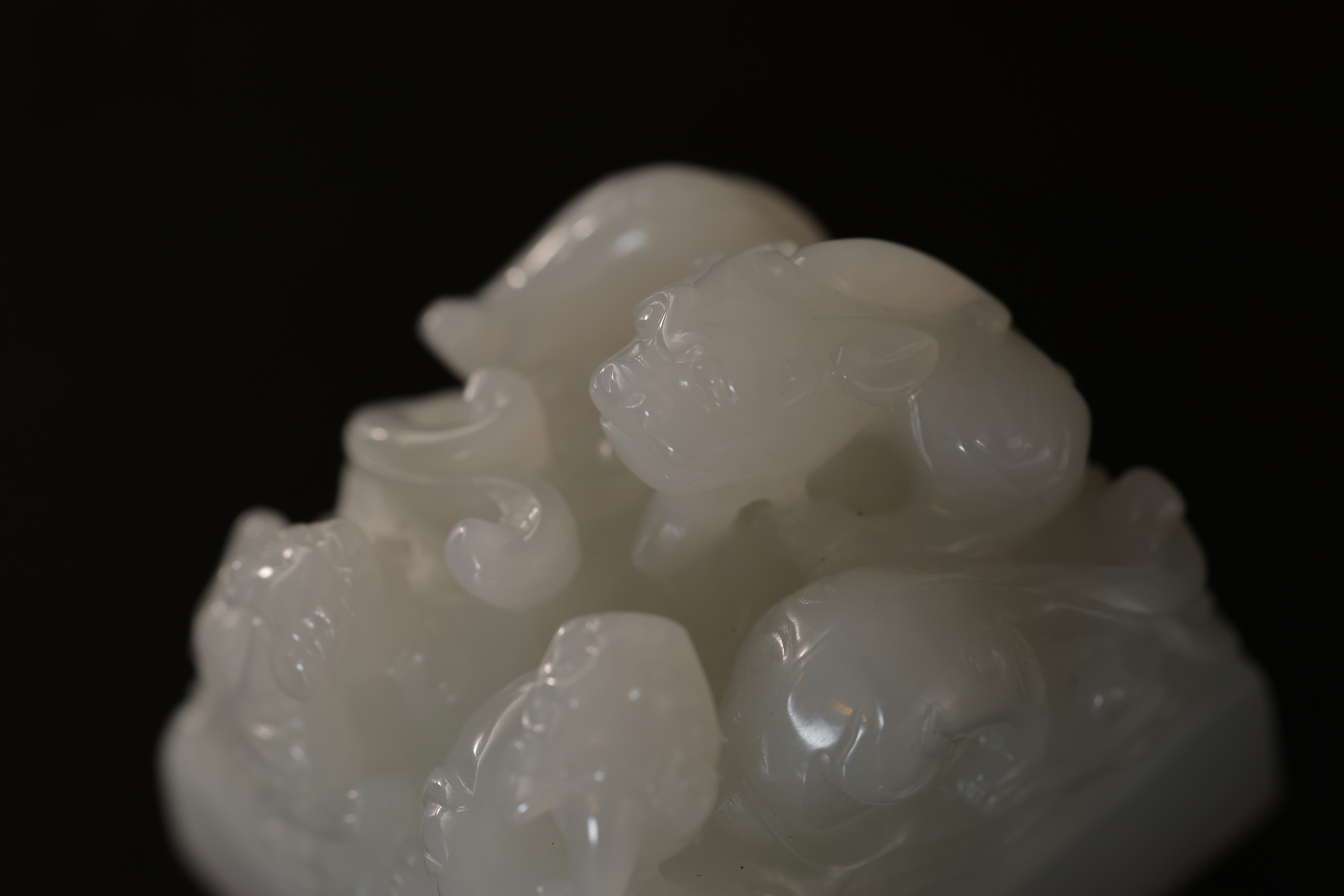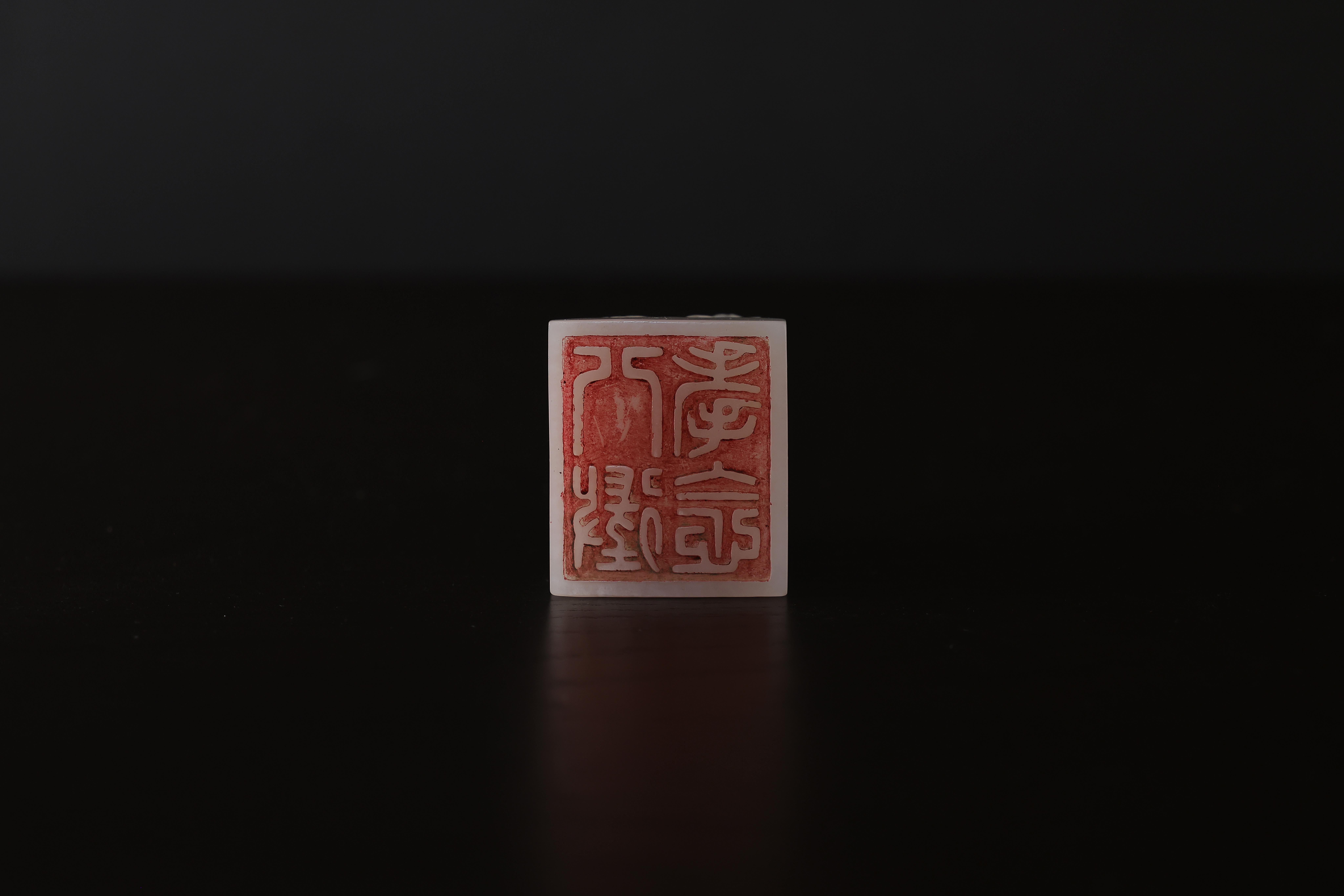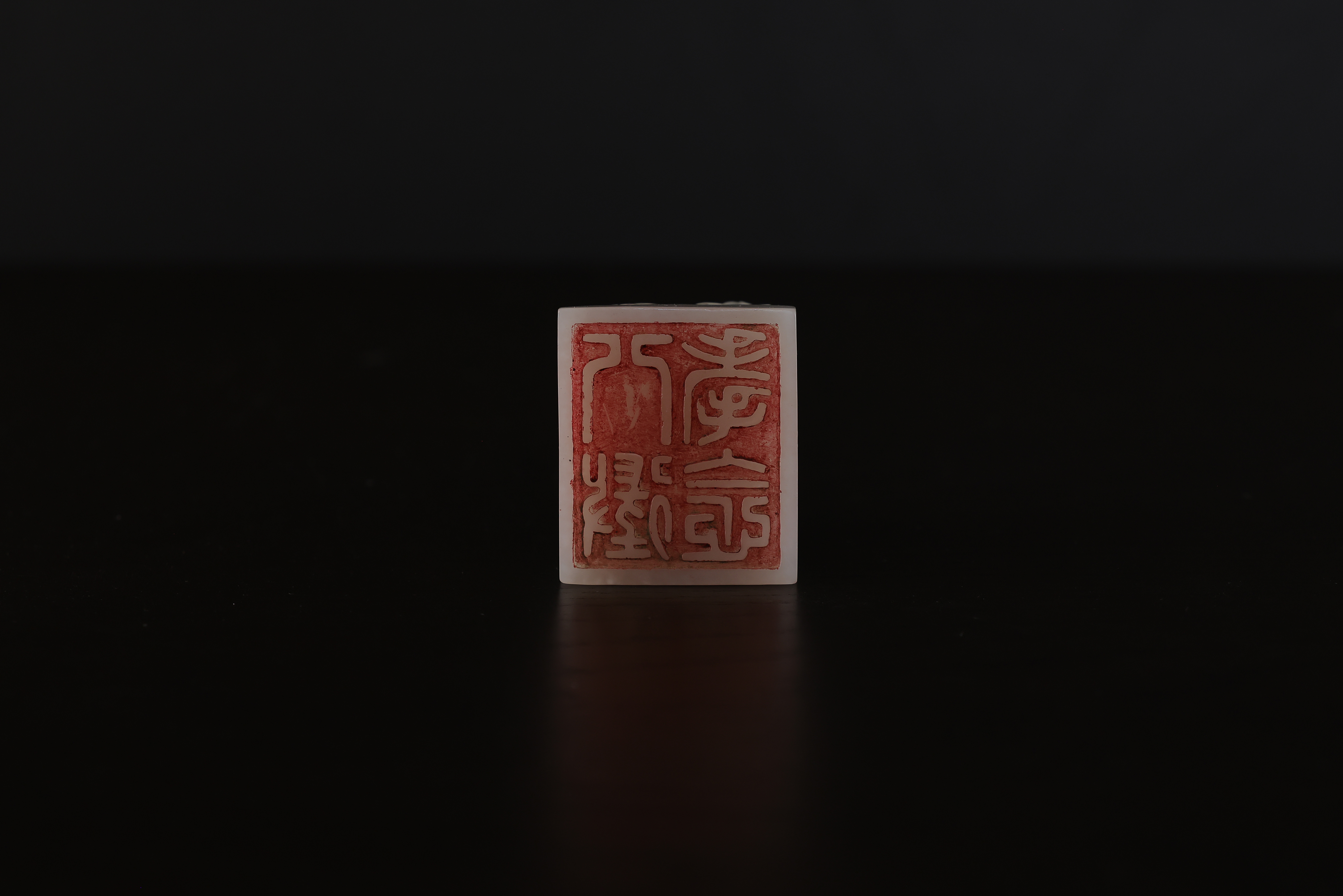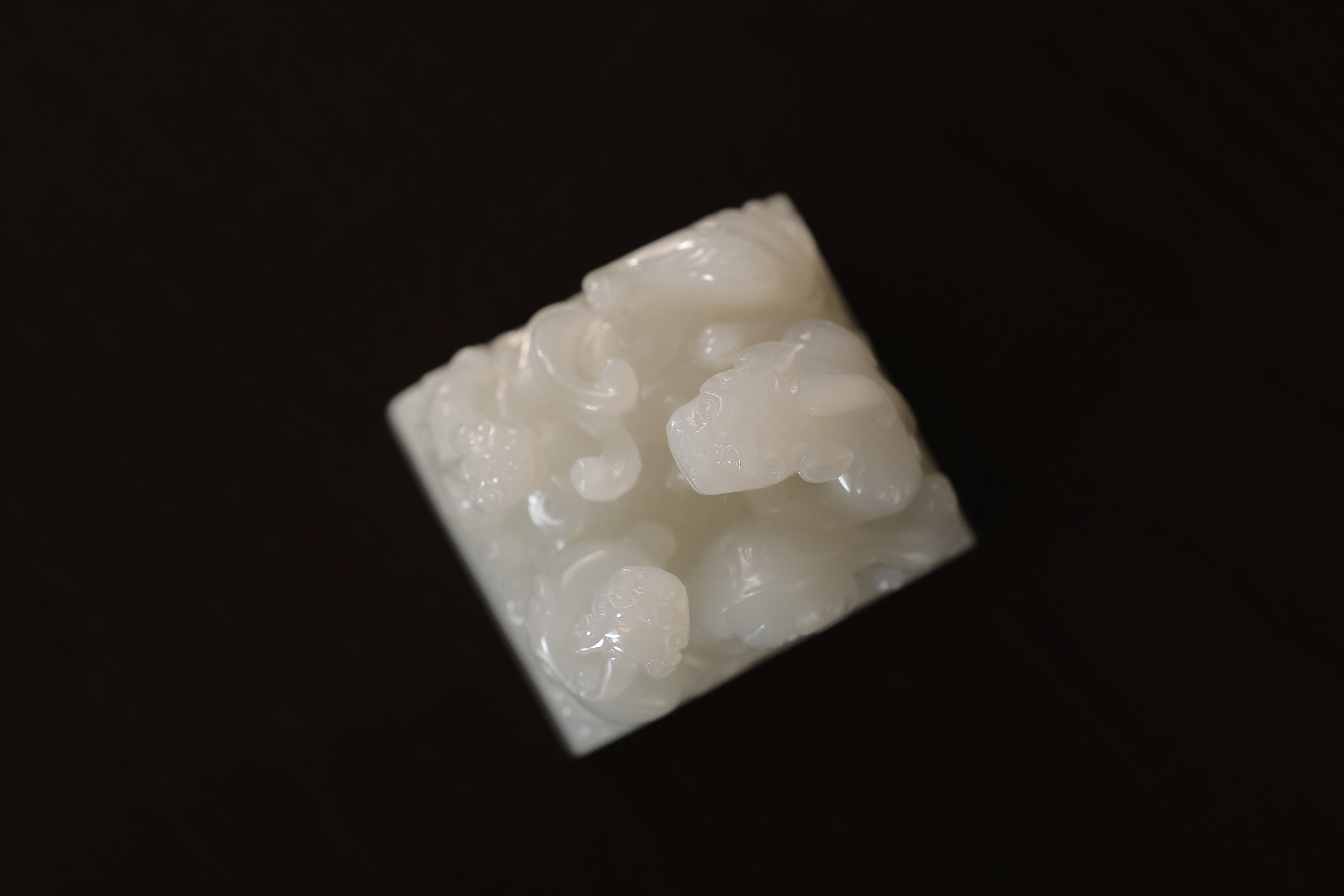 此玺爲清乾隆時期禦制“和田玉八征耄念之寶”,以上乘白玉精雕而成,玉質溫潤細膩,色澤瑩潔如脂,呈凝練的羊脂白。印體方正厚重,棱角分明,規整端莊,顯帝玺威儀。紐作雙螭龍盤踞祥雲之上,龍身蜿蜒起伏,鱗鬣精致,氣勢遒勁,雕工圓熟生動,寓意祥瑞護佑、乾坤永固。印面朱文篆刻,筆畫古樸遒勁,刀法穩健厚重,氣勢恢宏。此印爲乾隆帝八旬壽慶所制,以紀其“八征功成、福壽並臻”之盛世自況,兼寓“天命綿長、國祚恒昌”之意。整體造型雄健典雅,玉質與工藝相得益彰,展現出乾隆禦制玉玺莊重雍容、精工入微的皇家氣象,堪稱清代宮廷玉雕藝術的巅峰之作。