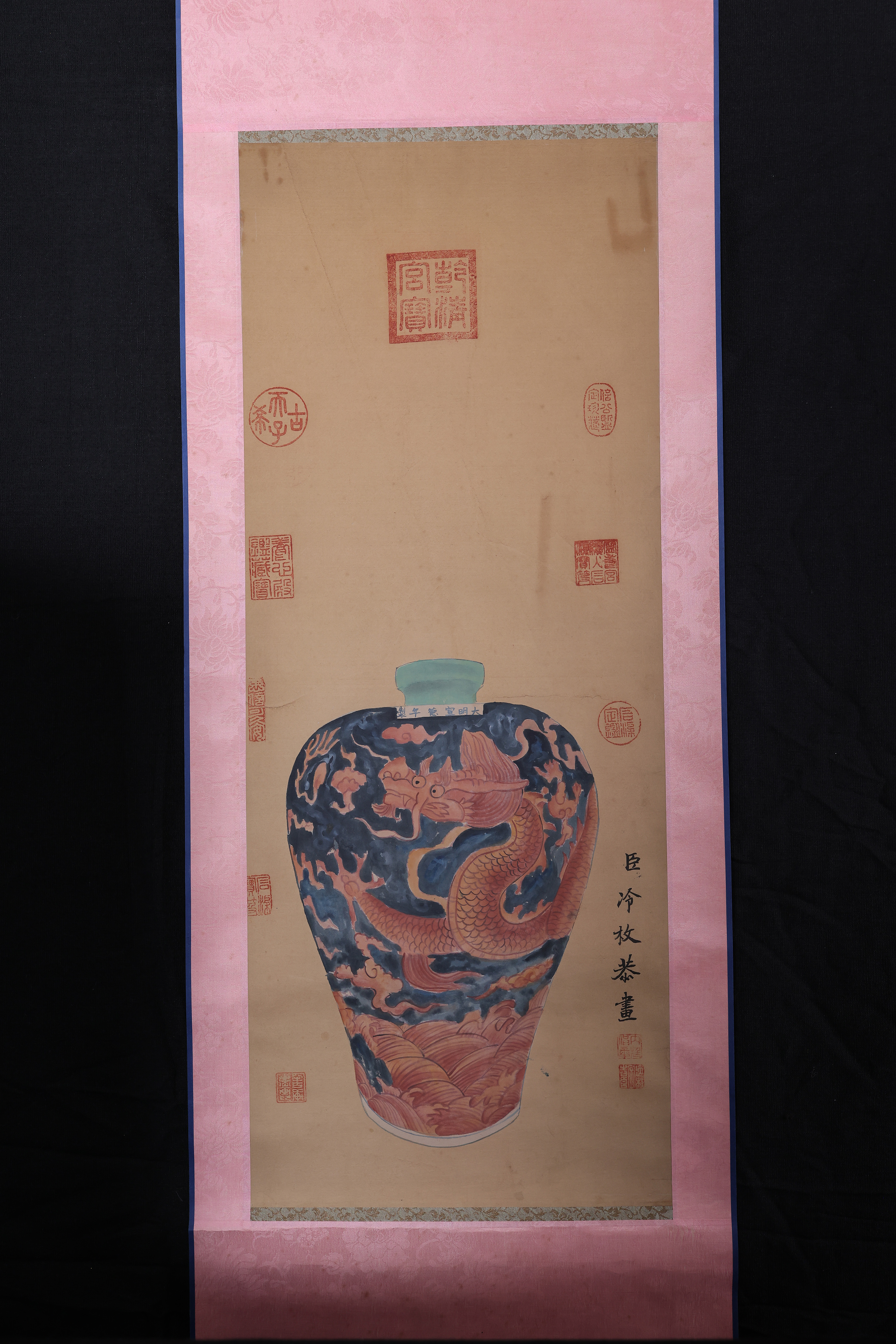宣德壹朝禦窯瓷器以工藝極精、胎釉俱佳、色彩典雅著稱,尤以青花礬紅作品最爲稀見,常用于陳設、賞賜及宗廟禮器。此瓶附帶紫檀原裝匣盒與宮廷繪像檔案,畫上可見器形、紋飾與龍紋布勢皆壹壹對應,旁題郎世甯署名與印玺,爲清宮內府典藏及禦賞之實錄,極具曆史文獻與皇家收藏價值。