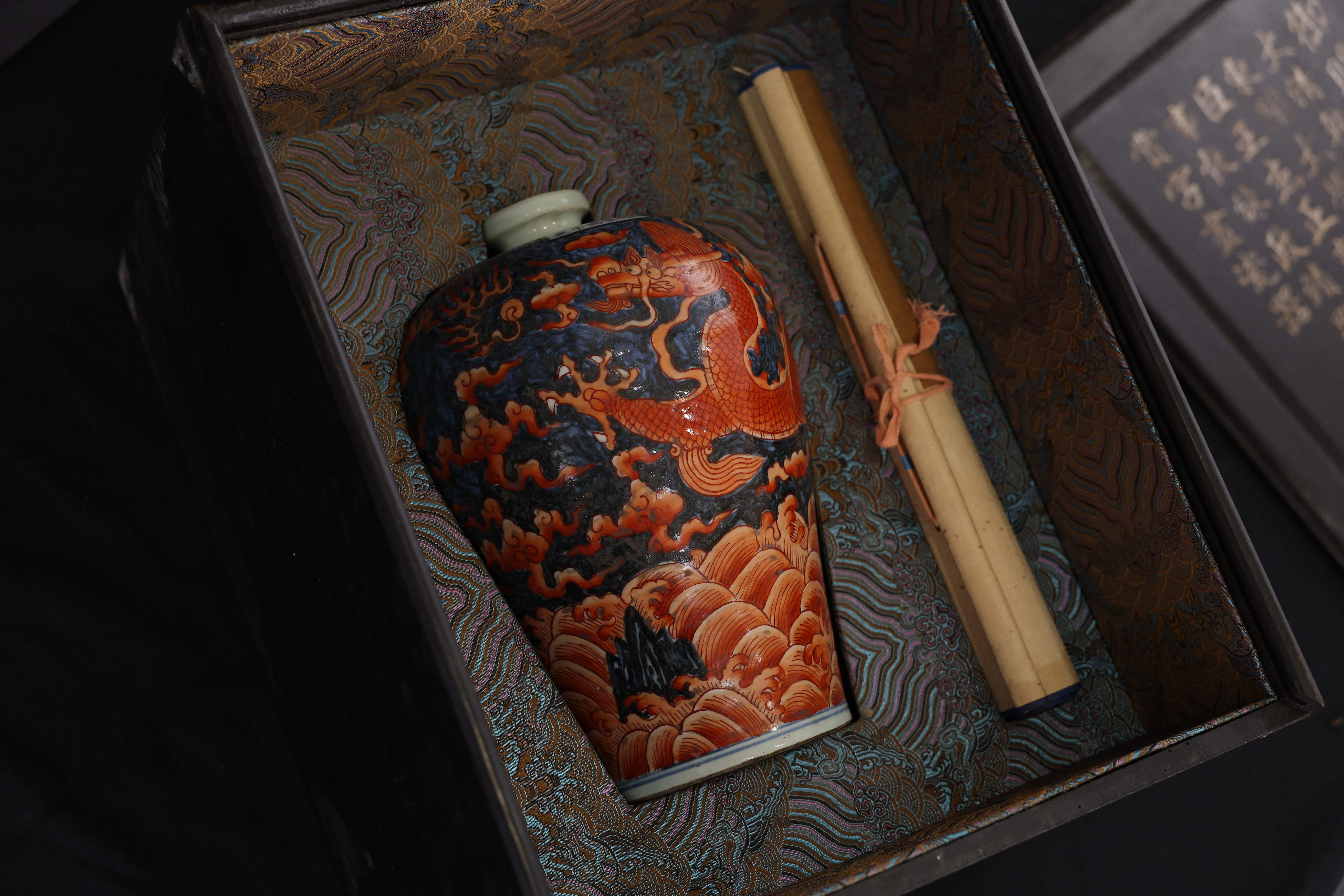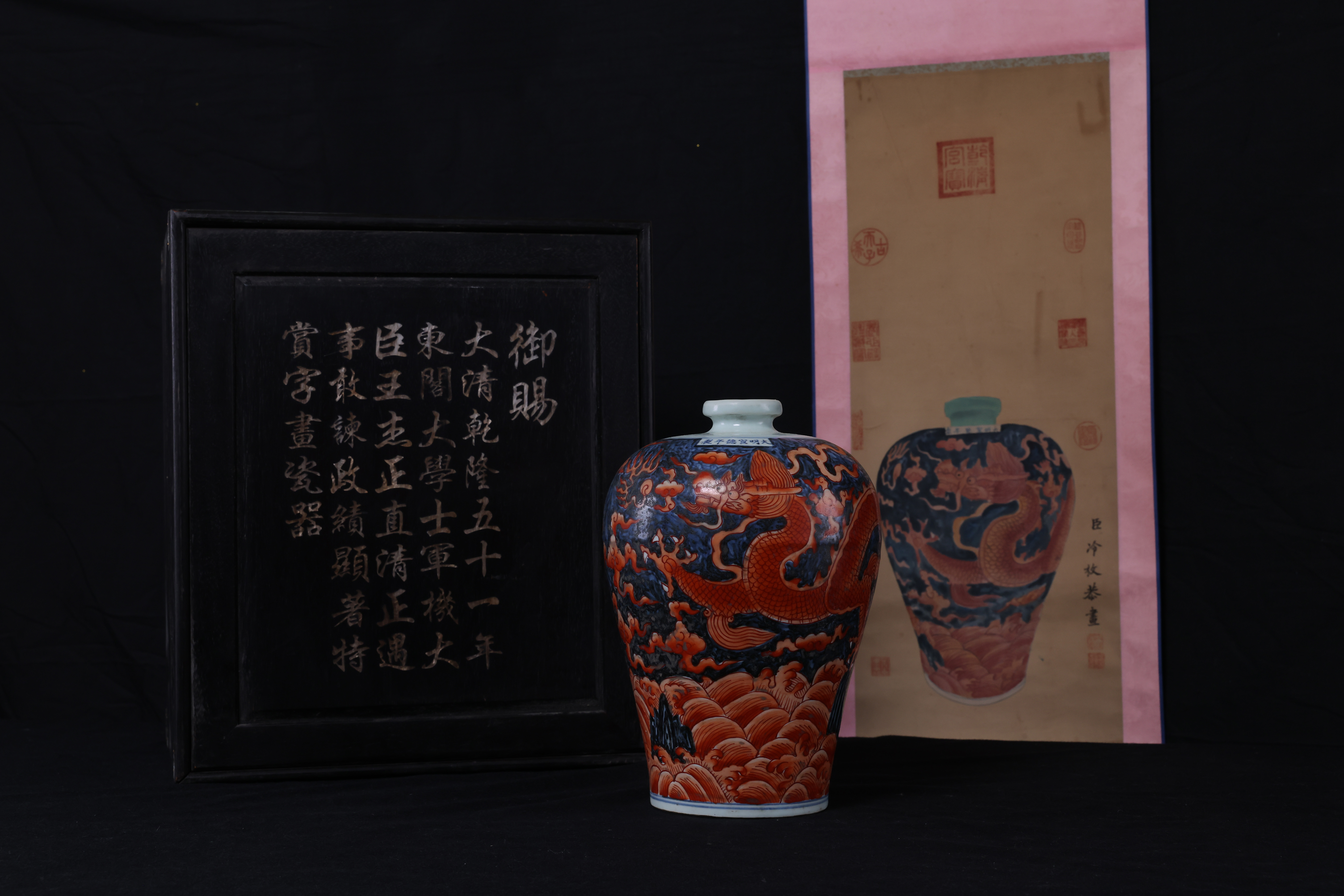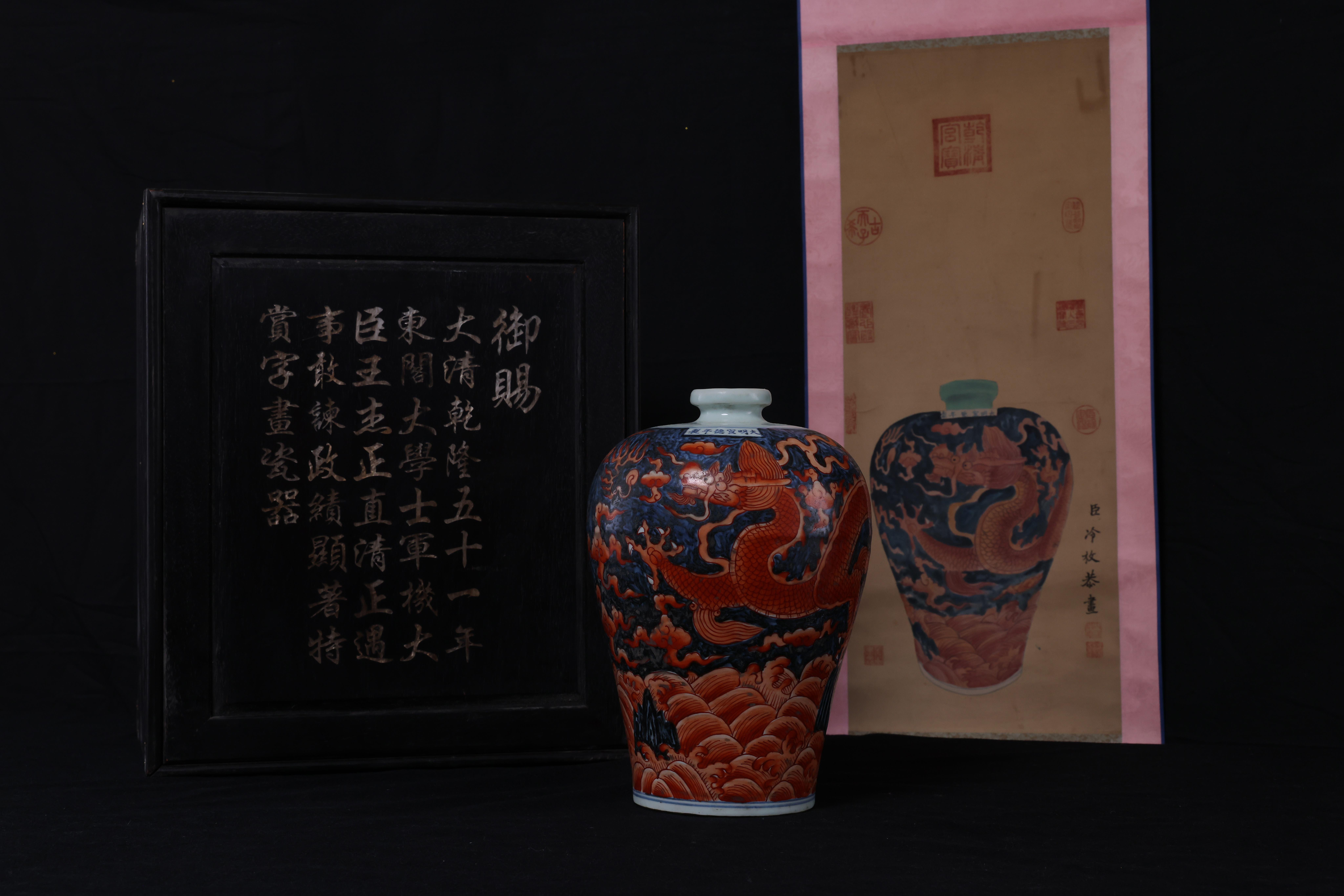 此器爲明宣德青花礬紅龍紋梅瓶,配紫檀原裝盒並附宮廷畫師,郎世甯繪制檔案畫,保存完備,極爲珍罕。器形端莊挺拔,肩圓腹豐,至底略收,比例精妙,線條柔和流暢,盡顯明初宮廷禦瓷之典範氣度。