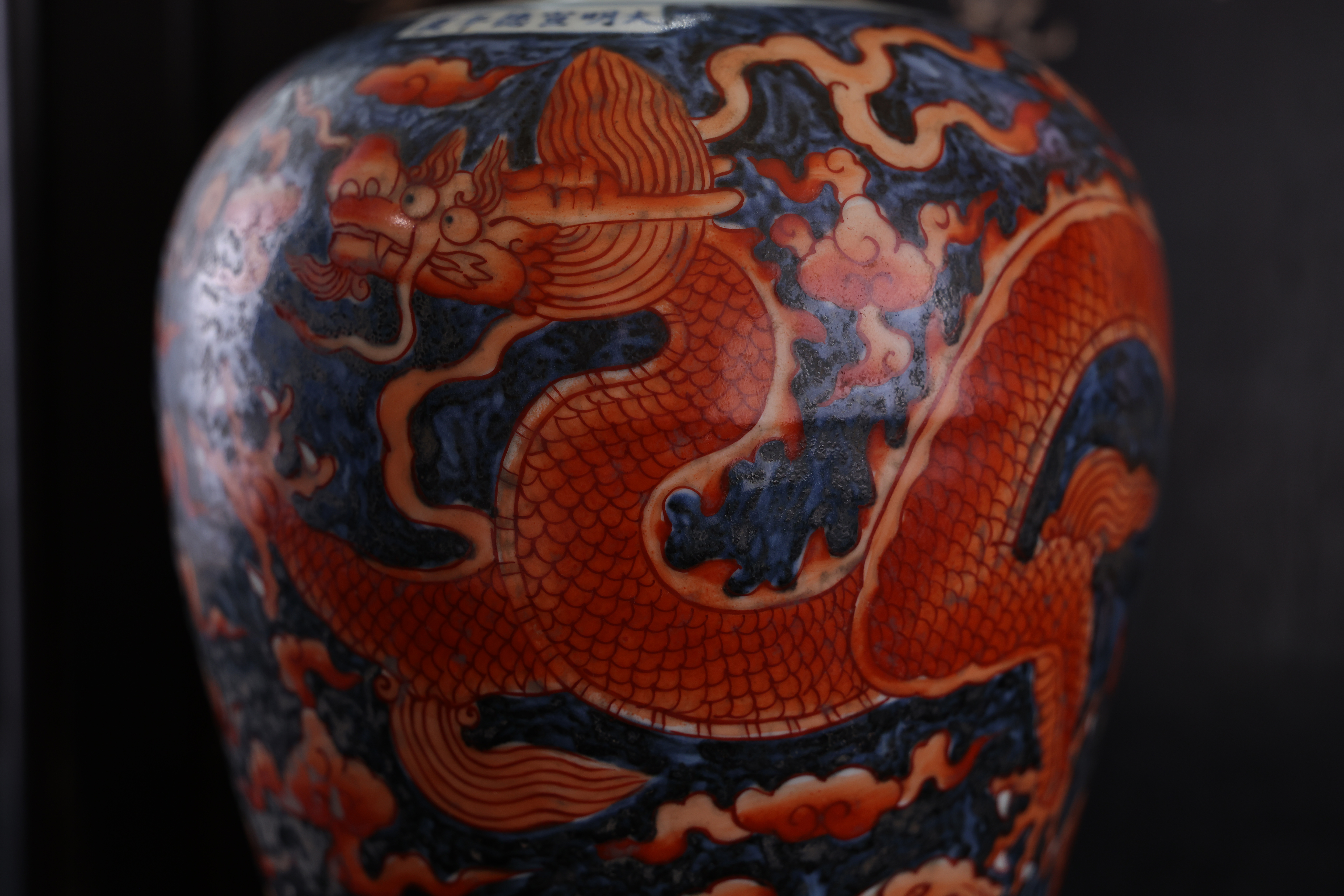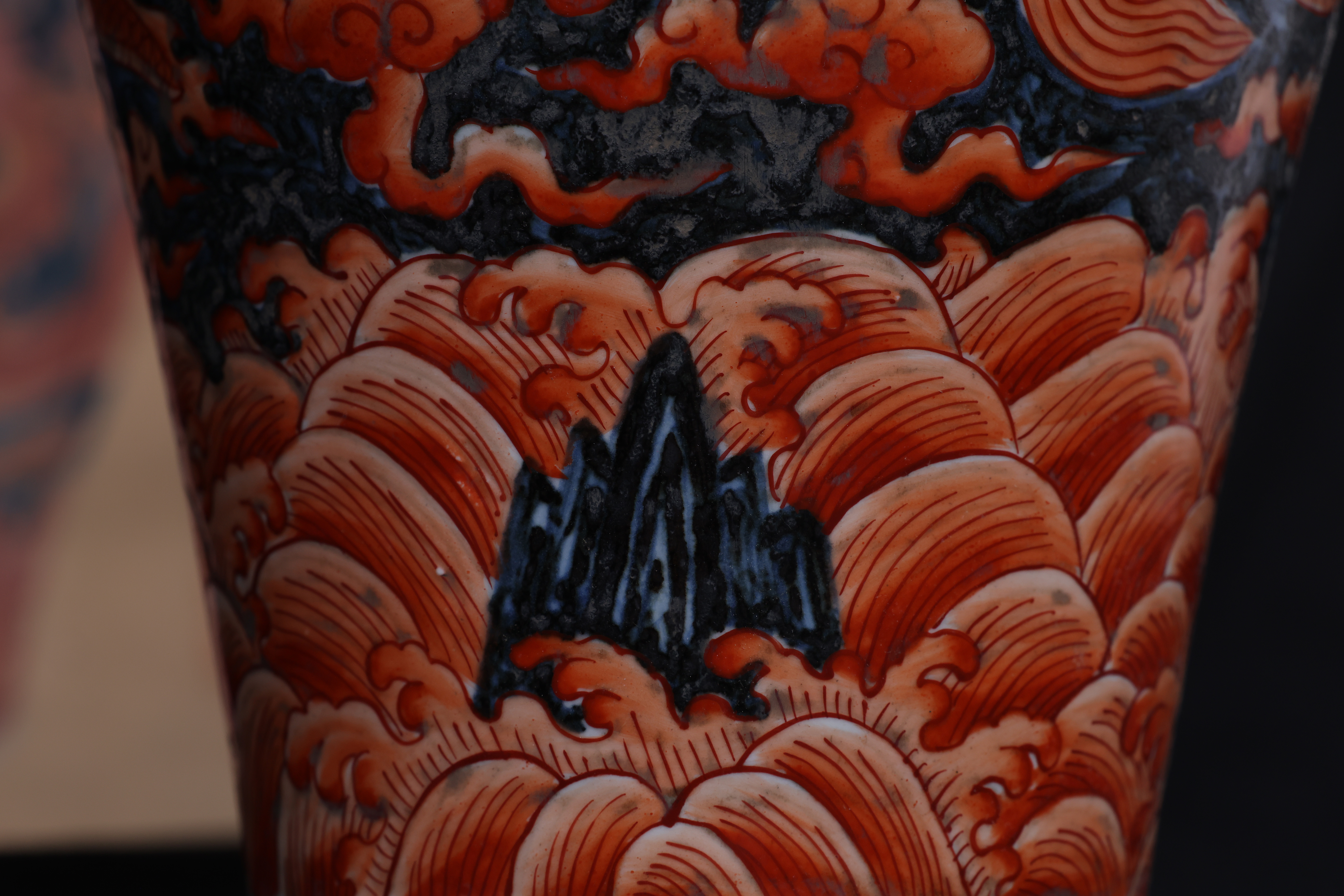 通體以青花爲地,礬紅繪龍紋。釉質瑩潤如脂,青花色澤沈穩,發色藍中泛紫,爲進口蘇麻離青所特有。礬紅龍騰雲駕霧,鱗片以細筆勾勒,層次分明,神態矯健,氣勢磅礴,寓意“禦天行化”“帝王之尊”。海水江崖紋環繞瓶底,線條起伏如浪,流暢自然,構成強烈的動勢與視覺層次。整器青紅對比分明,剛柔相濟,色調華而不俗,呈“靜中有動,烈而不躁”之美。